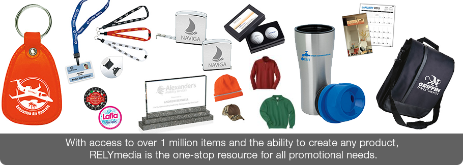 Even though we offer over 1,000,000 items, our specialty is custom products. Whether you are looking for an item not regularly sold as a promotional product or a completely custom creation, RELYmedia has the resources and solutions to meet your needs.